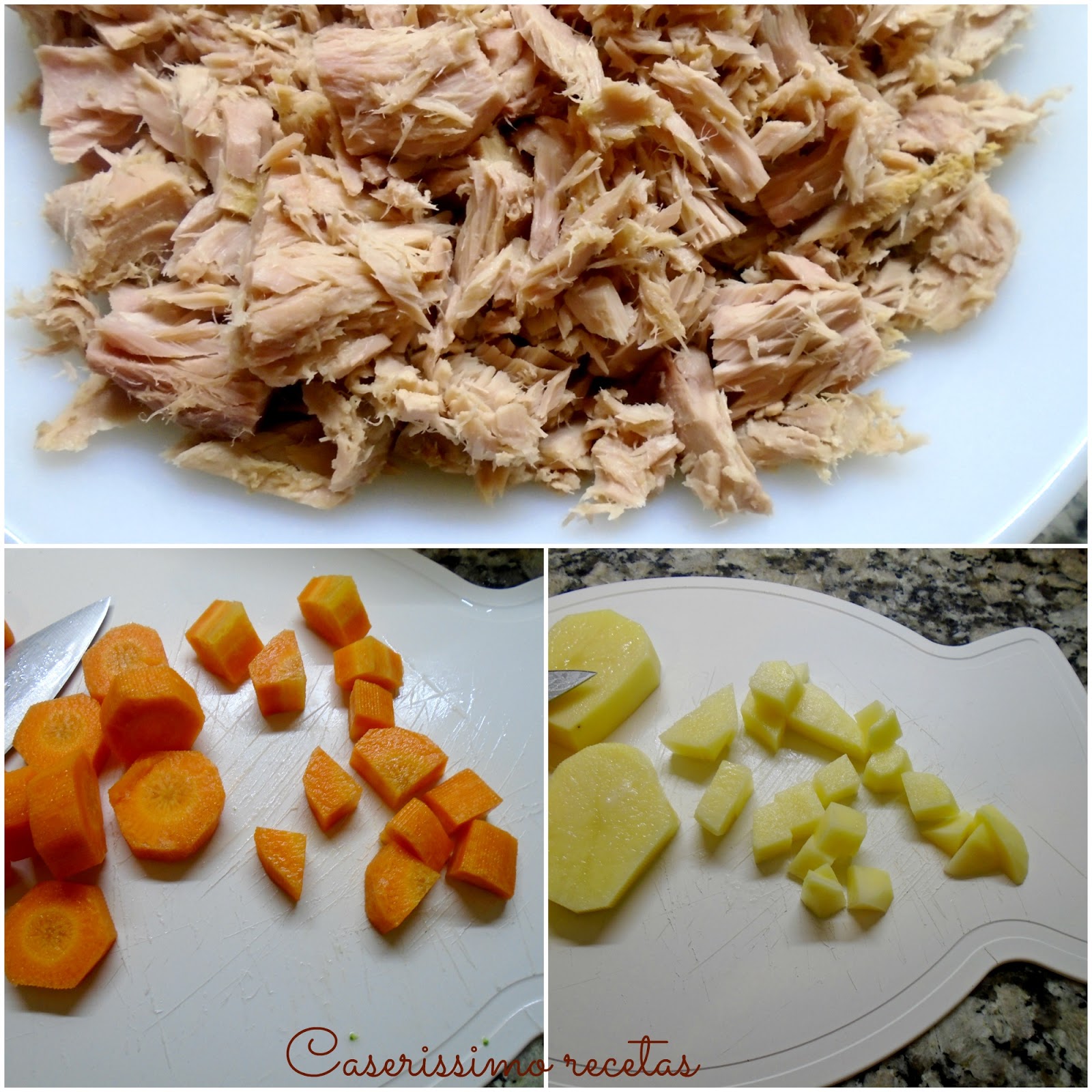 Pelar y cortar en cubitos las zanahorias. Yo las cocino en microondas por 10 minutos, tapadas y a potencia máxima, con 3 cucharadas de agua y revolviendo a los 5 minutos. Pero pueden hervirlas, no con las papas, hasta que estén tiernas.