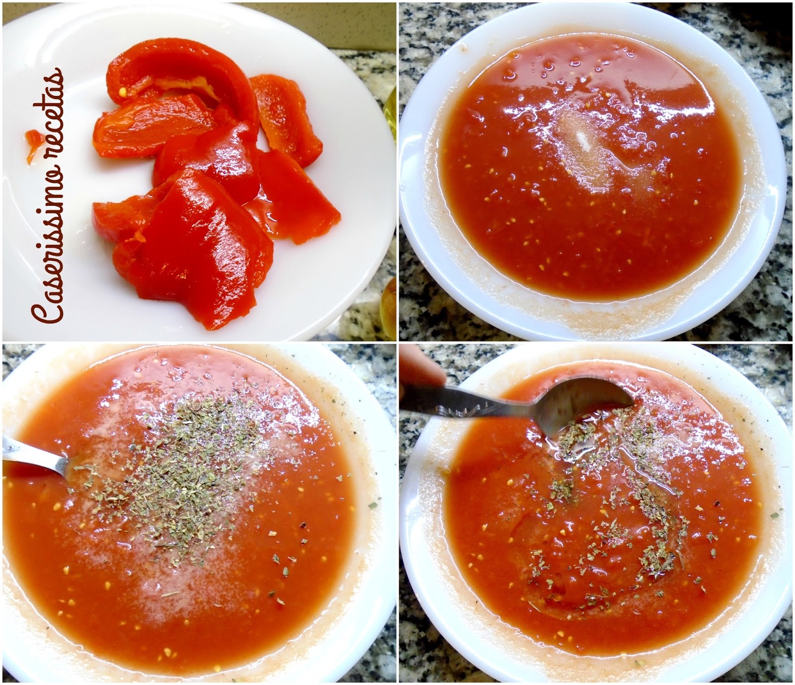 Pisar bien los tomates sin piel. Añadir la sal, el aceite, el azúcar y la albahaca u orégano. Remover bien y reservar.