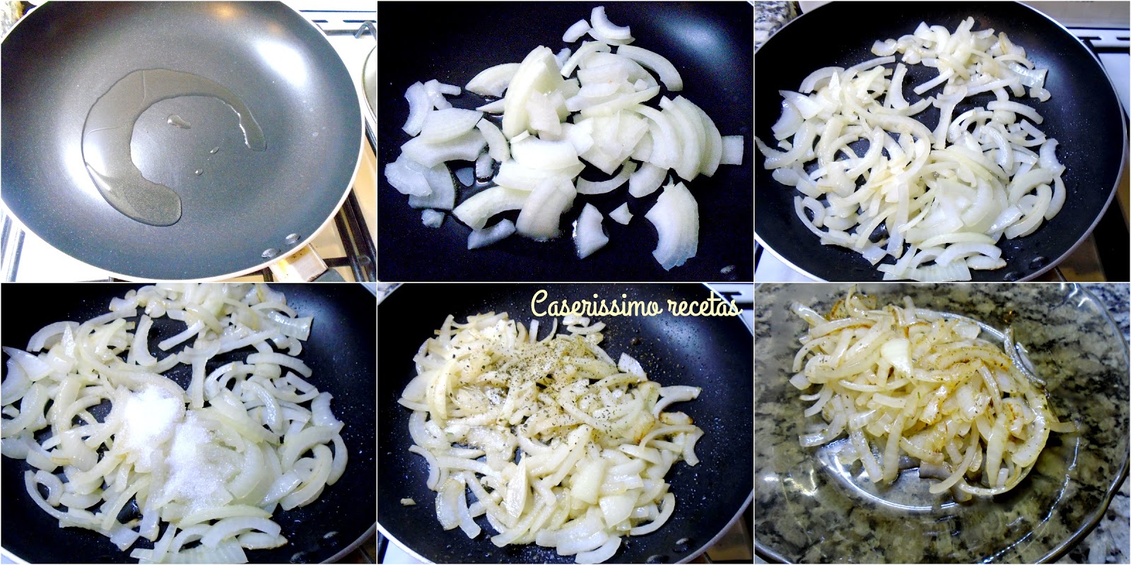 Cortamos la cebolla en juliana fina y la rehogamos en el aceite. Cuando brilla agregamos el azúcar. Revolvemos un poco y cuando dora agregamos la sal y el orégano. Dejamos que se impregnen los sabores un minutito y retiramos de la sartén a un plato. Dejamos la sartén como está y preparamos la masa.