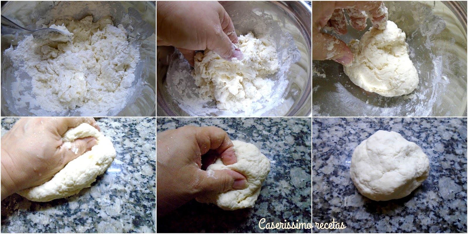 En un bol colocamos la harina, luego en un costado la sal y en otro el polvo de hornear. Añadimos el aceite y mezclamos un poco. Ahora vertemos el agua y mezclamos. Luego amasamos un poquito, unos 3 minutos y dejamos reposar unos minutos.