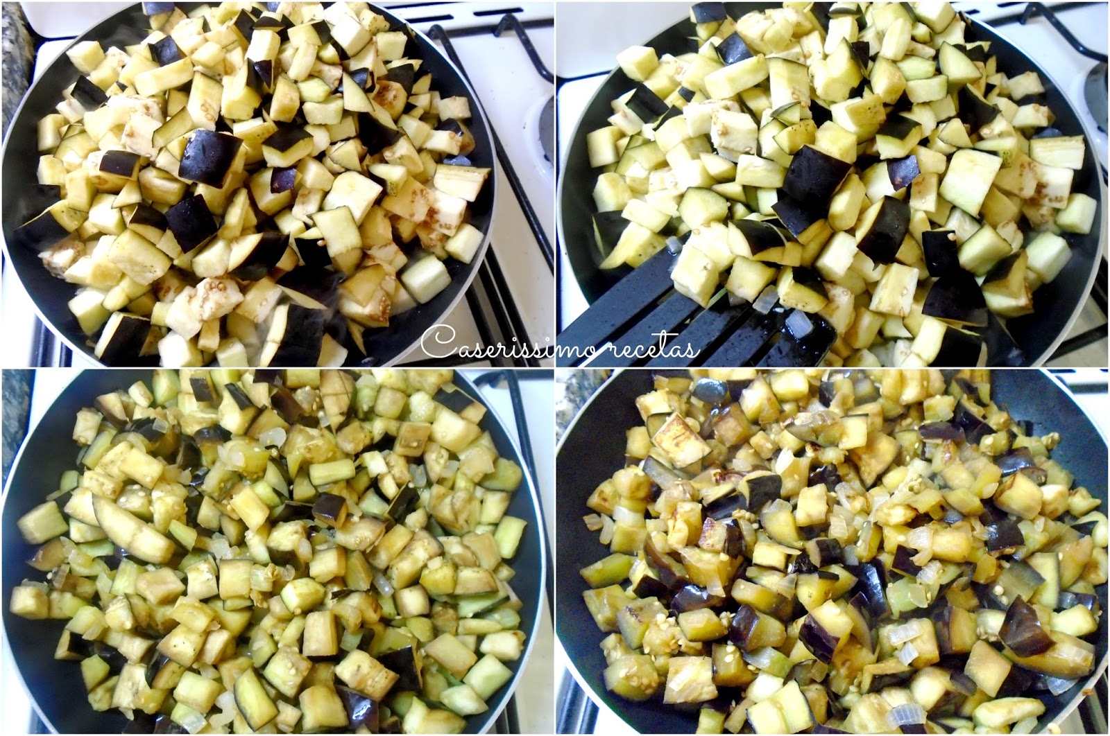 Incorporamos las berenjenas cortadas en cubitos medianos, no muy grandes!!! Primero a fuego fuerte y removemos. Luego de 3 o 4 minutos, bajamos el fuego, salamos y dejamos cocinar, removiendo de vez en cuando por 15 minutos. Comprobamos si están tiernas (en el centro del cubito tiene que haber resistencia pero debe estar mas blando por fuera. Si no están listas dejamos unos minutos mas, removiendo de vez en cuando.