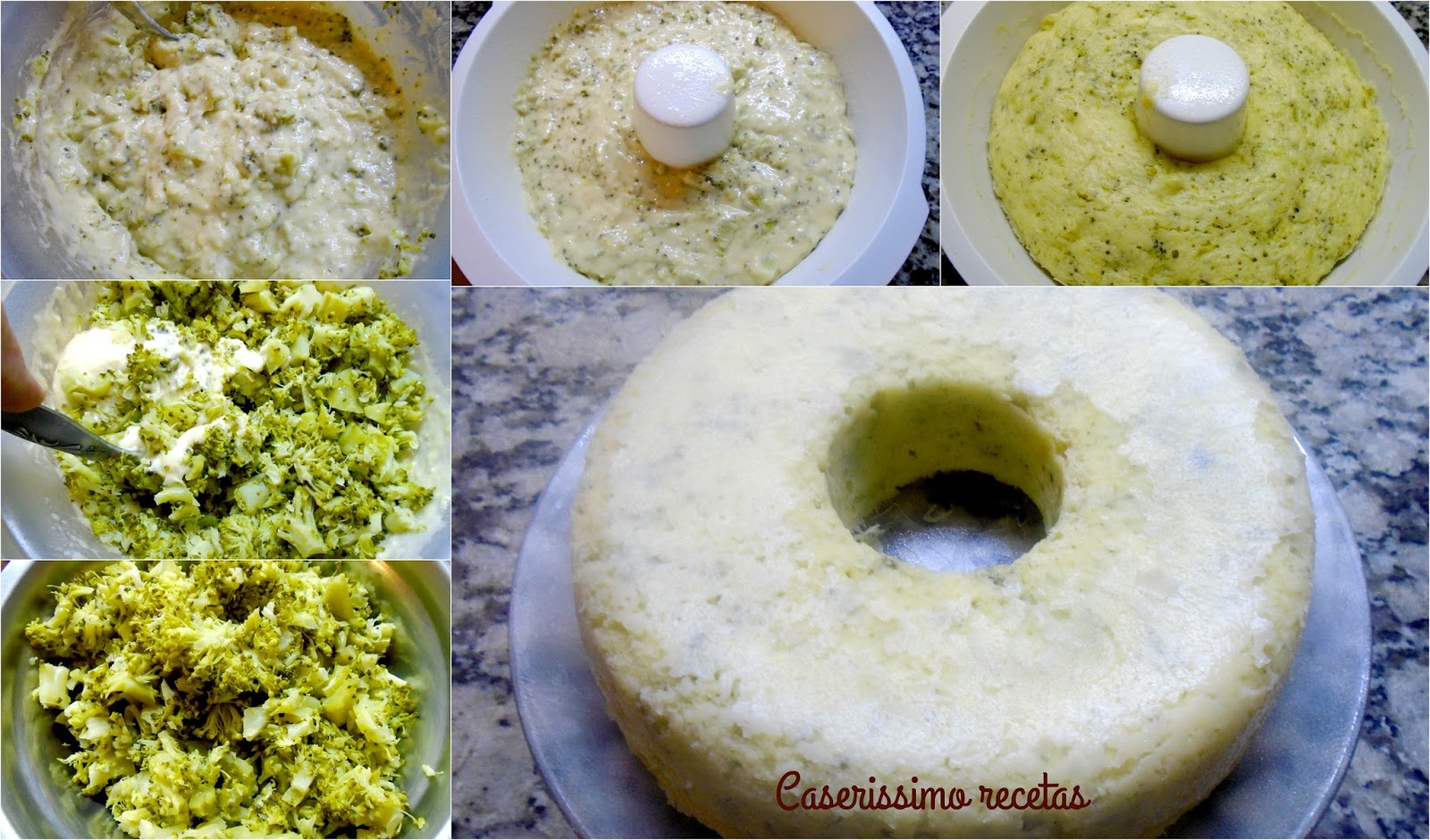 Mezclamos bien pero muy bien y agregamos el brócoli picado bien chiquitititititito. NO PROCESADO!!!!! Mezclamos muy bien y volcamos en un molde savarín de 22 cms aproximadamente, previamente rociado con rocío vegetal o enmantecado o aceitado y enharinado.