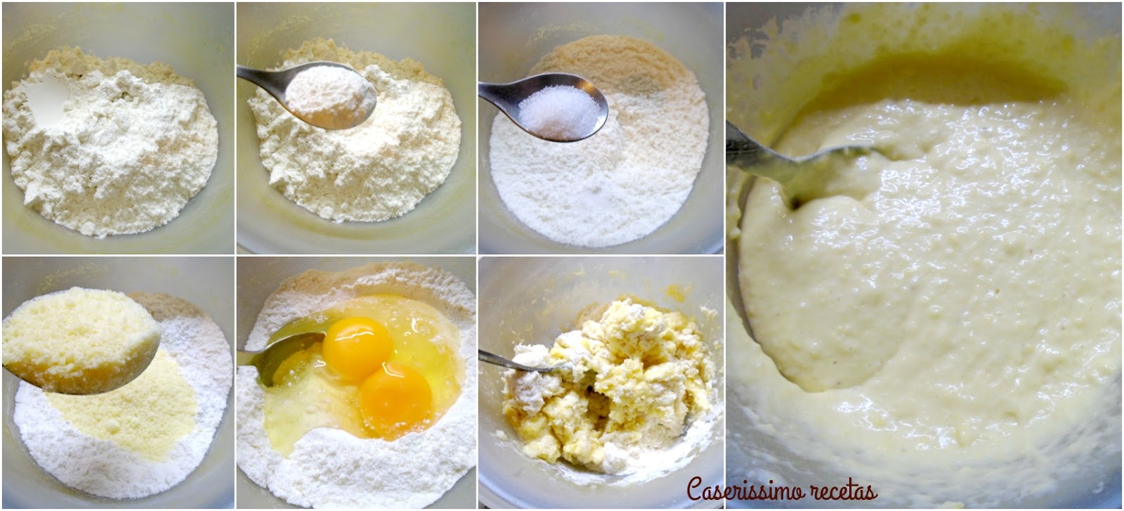 Ponemos la harina, el polvo de hornear, la sal y el queso en un bol y mezclamos. Añadimos el aceite y los huevos y volvemos a mezclar. Cuando todo se hace un pegote, añadimos el agua tibia.