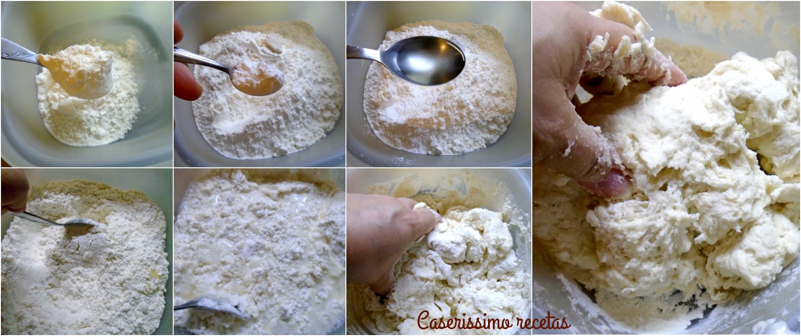 Poner la harina en un bol con la sal y el polvo de hornear sin que estos se toquen. Agregar el aceite y el agua, remover con cuchara un poco y luego tomar la masa con la mano, dentro del bol y amasarla hasta que se desprenda bien del bol y de la mano.