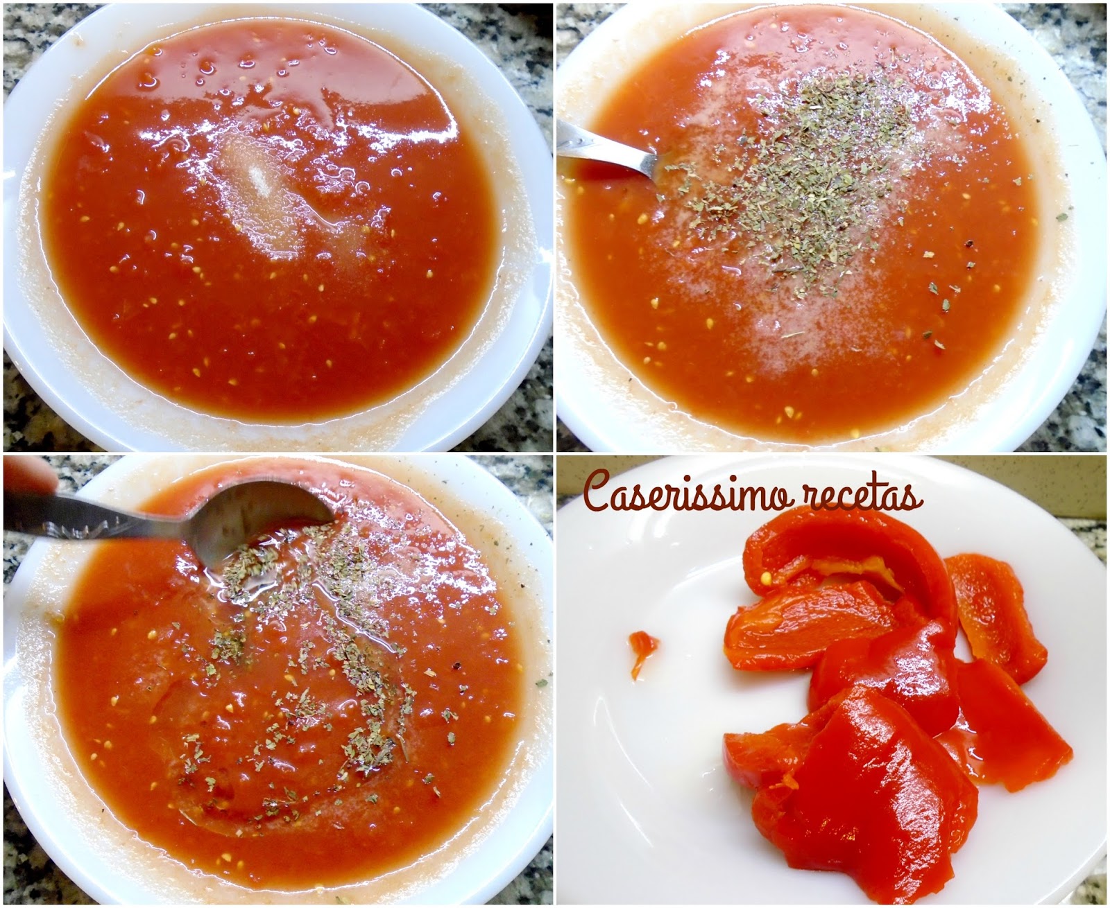 Pisar bien los tomates y añadirles la sal, la albahaca, el aceite y el azúcar. Mezclar bien y reservar.