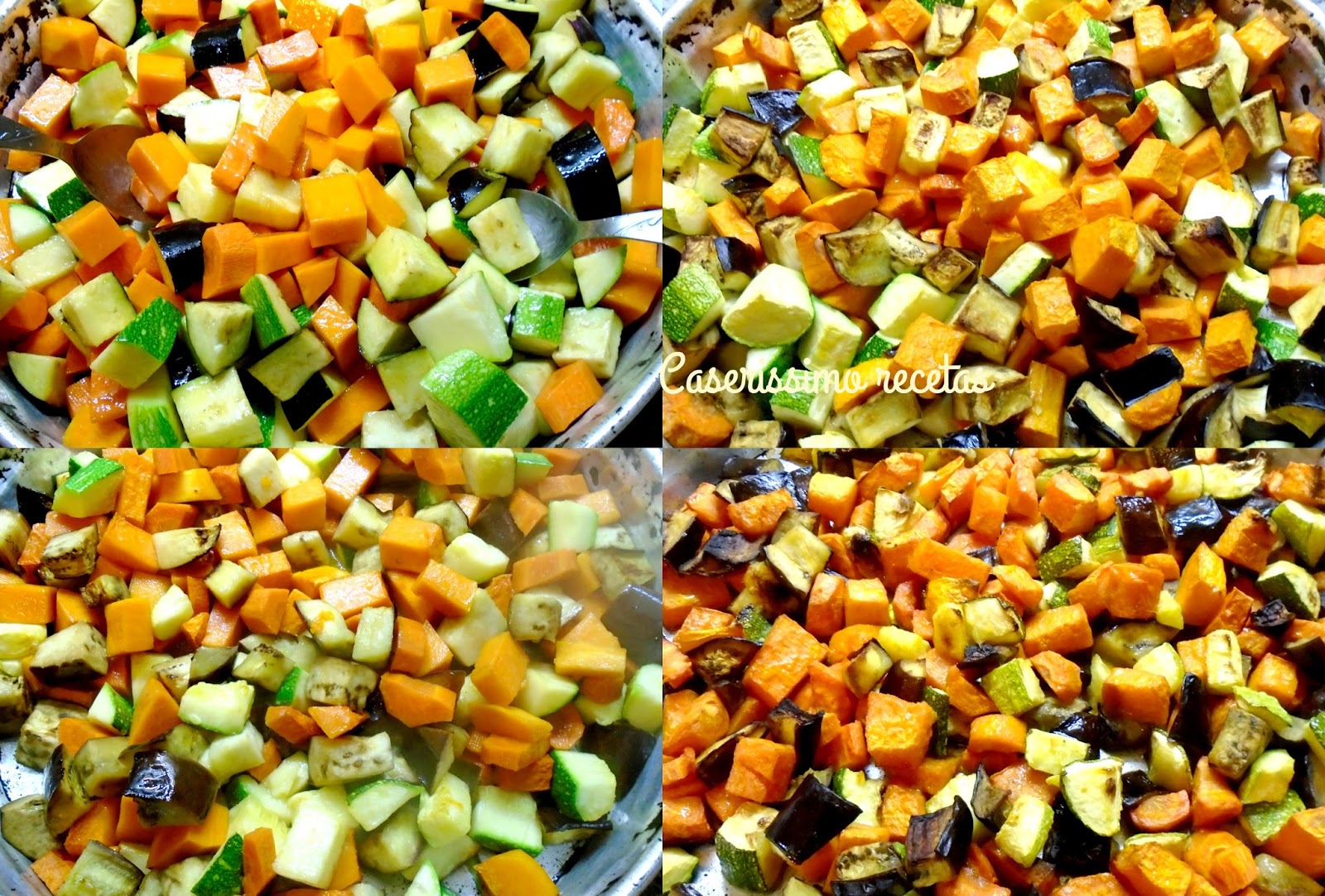 Por lo demás, pre calentamos el horno a 180° si solo tienen calor de abajo. Si pueden darle calor de arriba, tiene que estar lejos de los vegetales y puede estar a 220°. Para mi es mas conveniente en horno de gas, en el cajón del grill, abajo y en el estante mas bajo, casi el piso. O en horno eléctrico, en el estante mas bajo y con calor de arriba. Pero si solo tienen horno común con calor de abajo, entonces horno medio, estante del medio y placa de aluminio para que no se queme, porque si es de hierro se arrebatan.