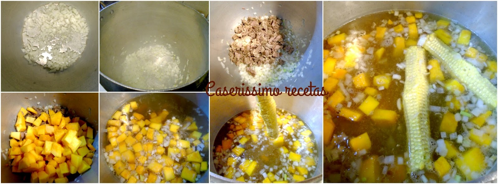 Agregamos la carne ya cocida el tiempo indicado. También agregamos el zapallo. Añadimos 3 litros de agua caliente. Colocamos 2 o 3 marlos (troncos) de choclo ya desgranados. Dejamos cocinar media hora.
