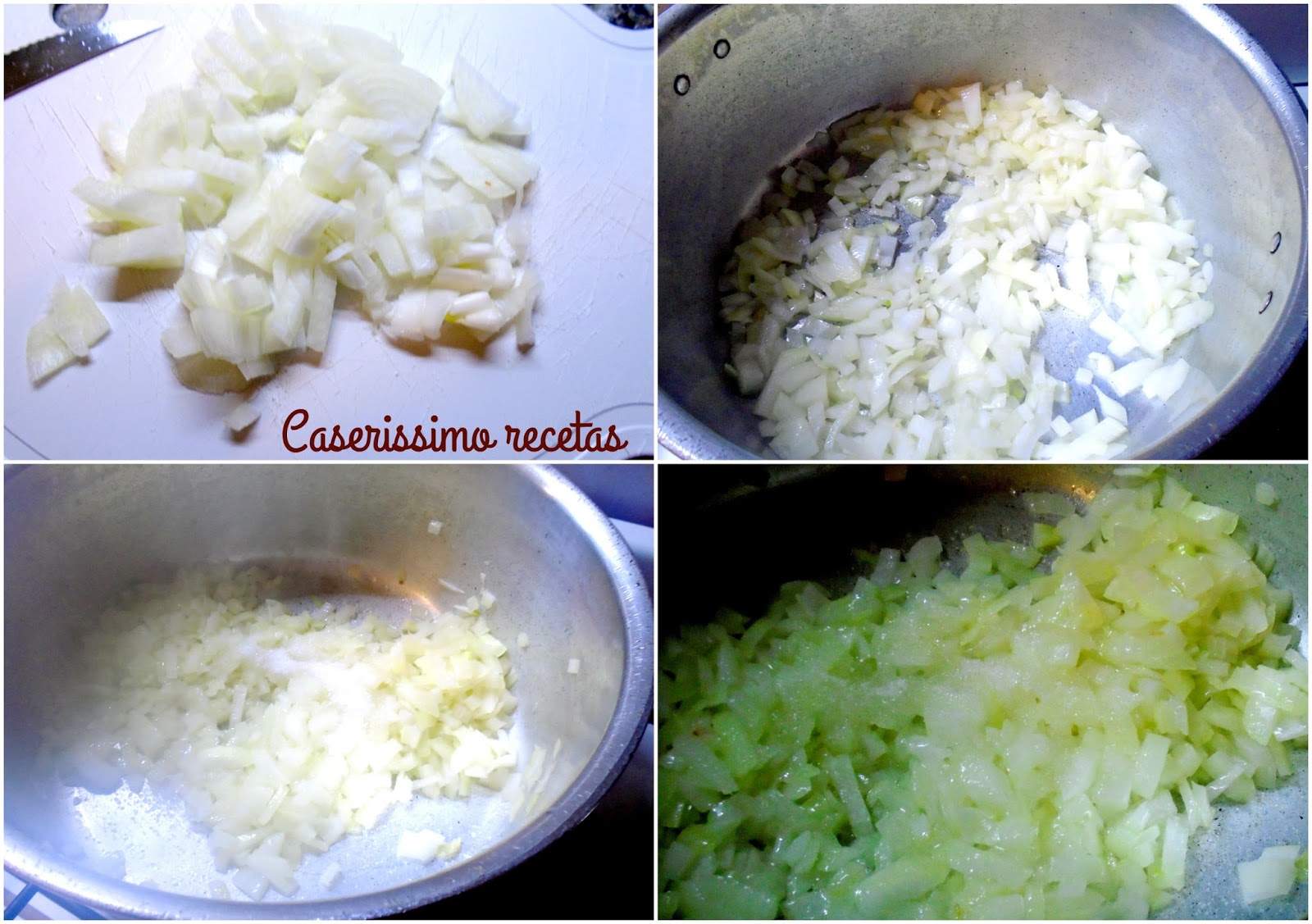 Picar la cebolla bien chiquita y rehogarla en el aceite, cuando brilla incorporarle el azúcar, remover y dejar dorar.