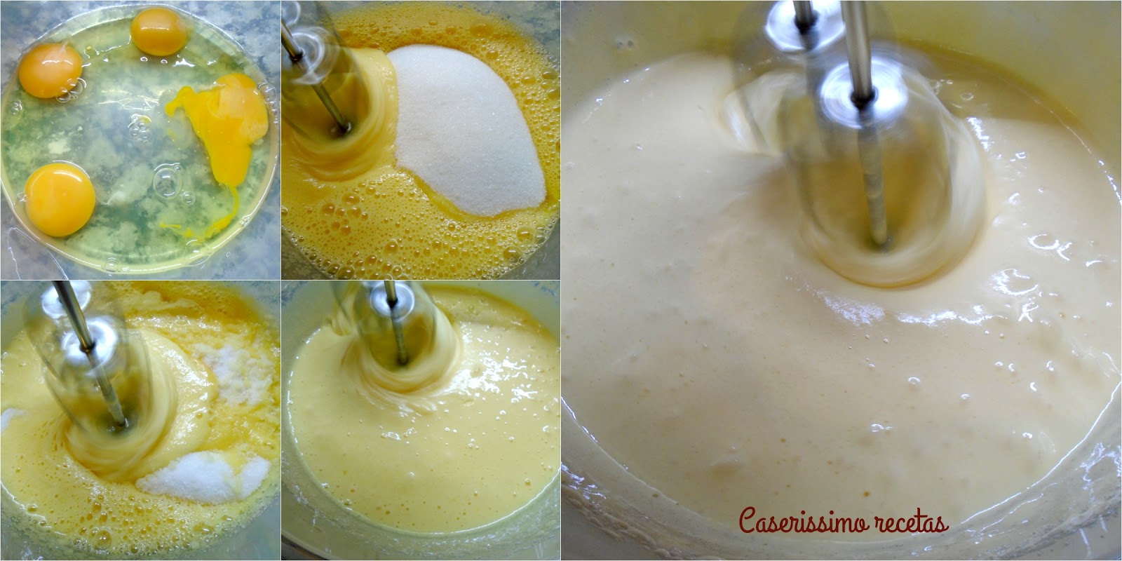 En otro bol batimos los huevos y añadimos el azúcar. Batimos hasta que esté blanco y se pueda dibujar levantando el batidor y dejando caer en hilo.