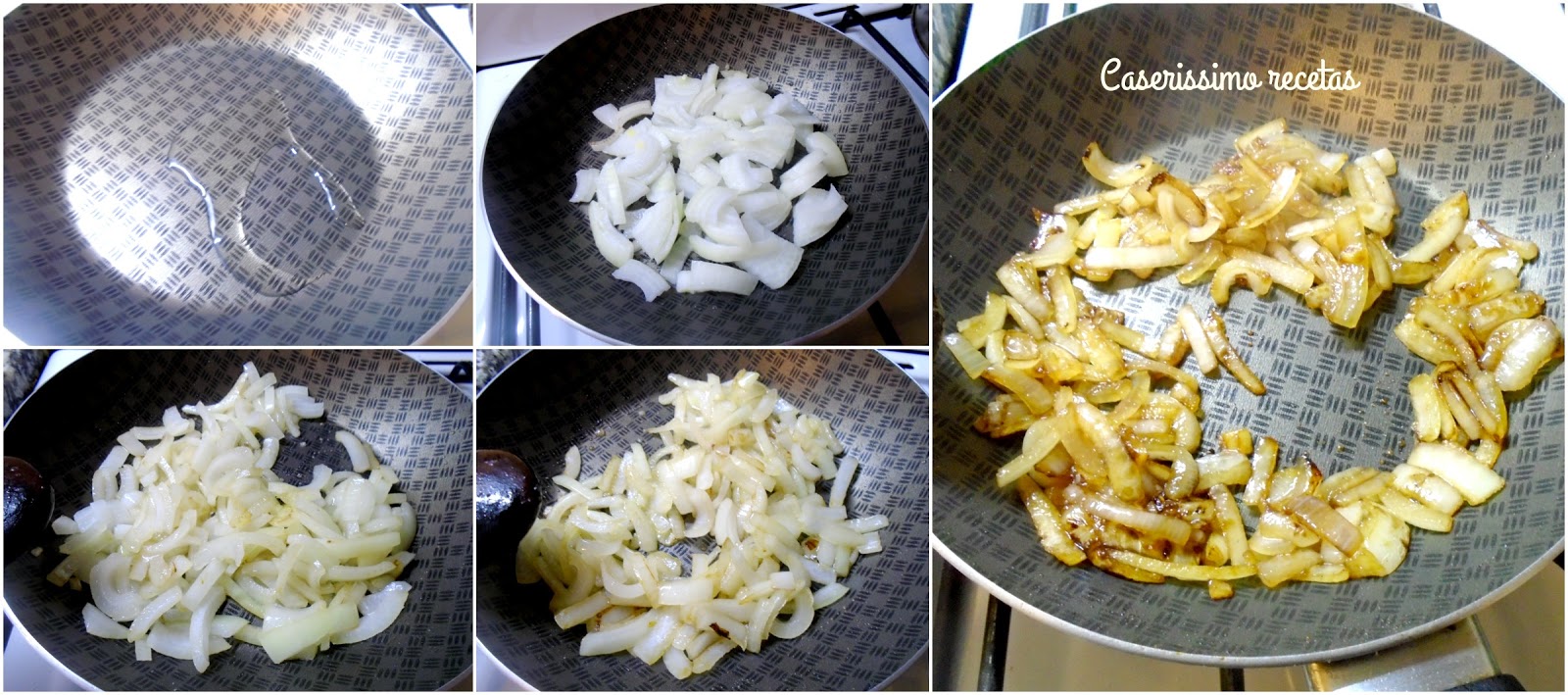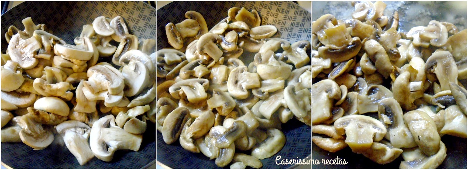 Calentamos el aceite y rehogamos los champignones sin agregar nada y a fuego fuerte. Cuando doran un poco los retiramos de la sartén y en el mismo aceite rehogamos las cebollas a fuego medio.