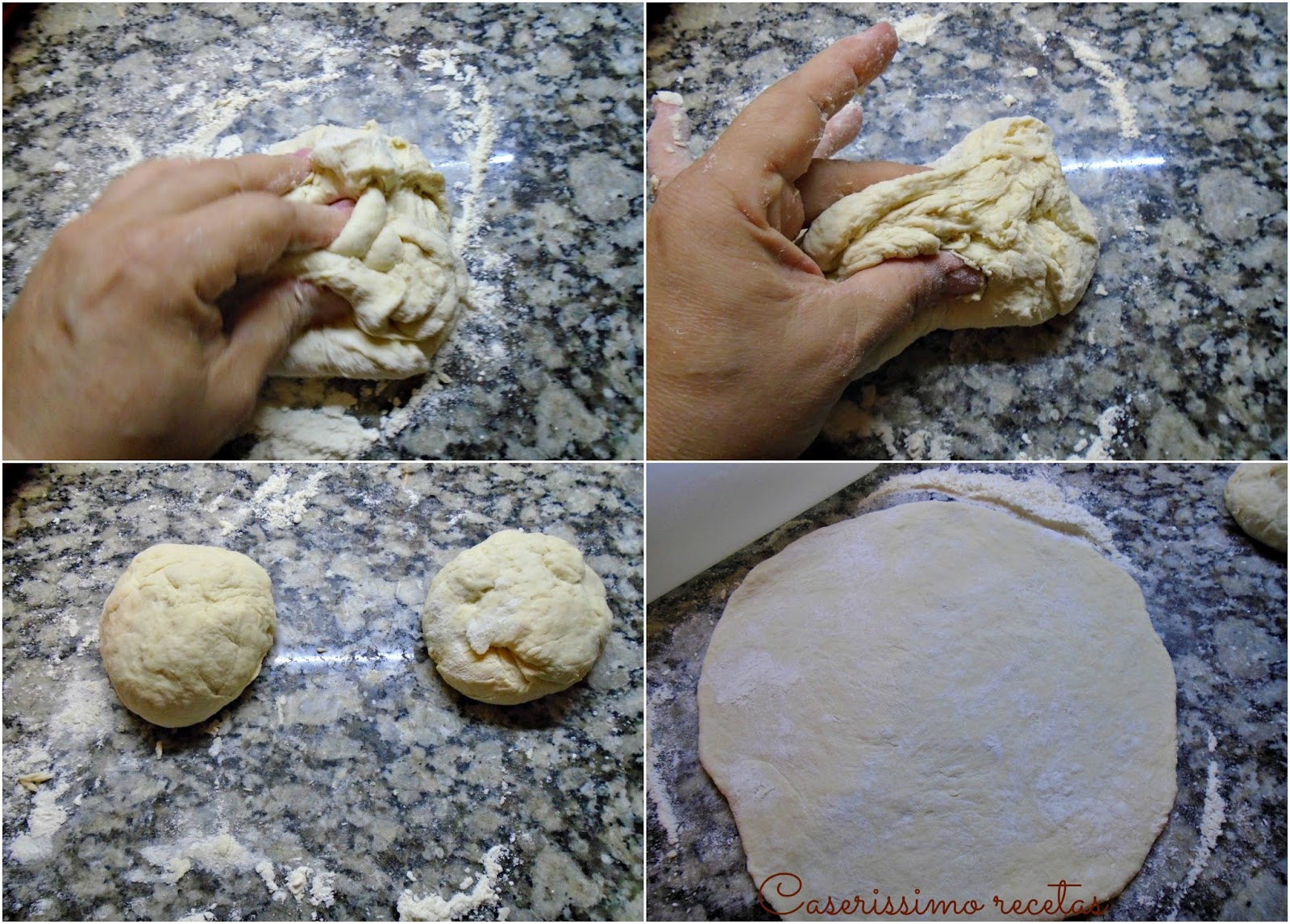Con un poco de harina espolvoreamos la mesada y amasamos otro poco, formamos un bollo y lo dividimos en dos. Lo estiramos con palote y un poco de harina, del tamaño de la sartén.