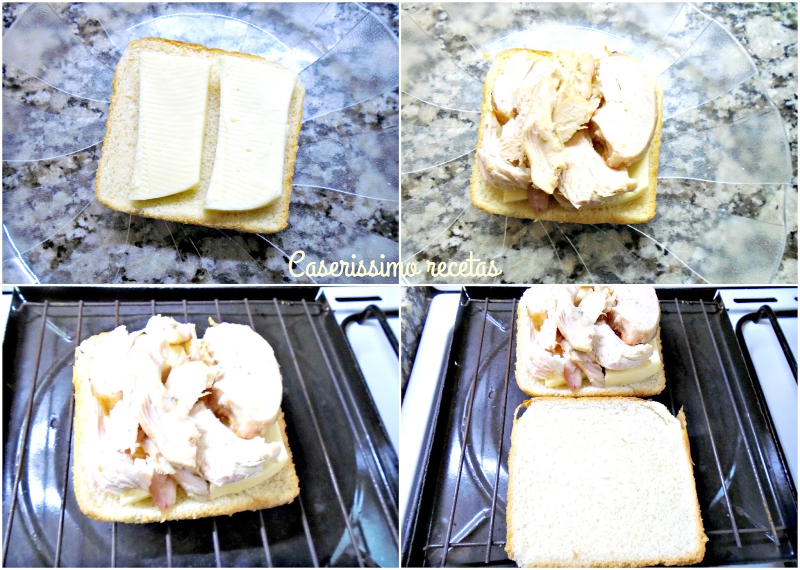 Colocamos el queso sobre una rebanada de pan y sobre el queso, el pollo.