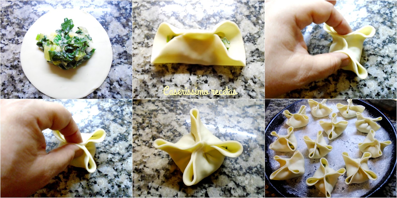 Una vez frío, colocamos una cucharada en medio de un disco de masa y juntamos los bordes paralelos con un pellizco y luego los del otro lado, pellizcando bien. Ponemos sobre la placa aceitada y enharinada. Llevamos a horno bien fuerte hasta dorar. Glup!