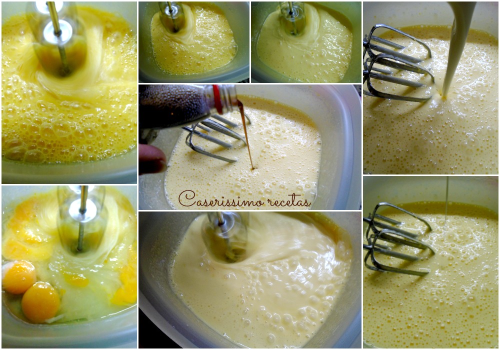Batimos los huevos con el azúcar hasta que no se sienta mas el azúcar con el batidor. Añadimos la esencia de vainilla y la crema y batimos un minuto mas.