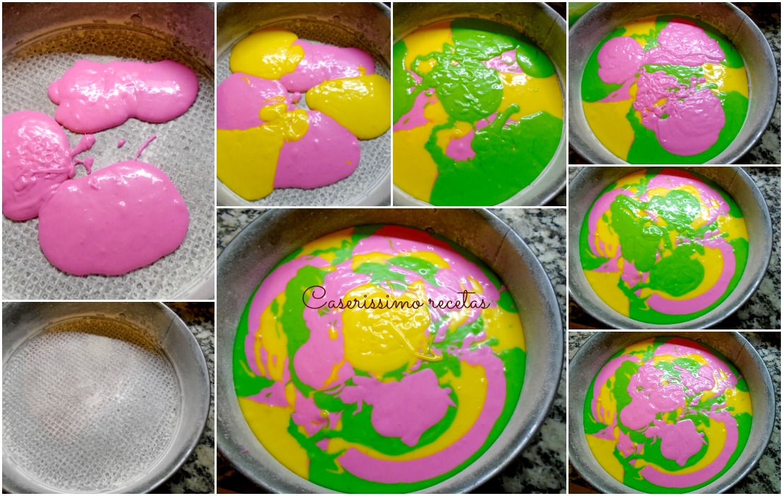 Enmantecamos y enharinamos el molde y con una cuchara ponemos 3 cucharadas grandes de un color, luego de otro y luego de otro, intercalando los lugares para que queden bien integrados.Usamos distintas cucharas, para no ensuciar los colores.