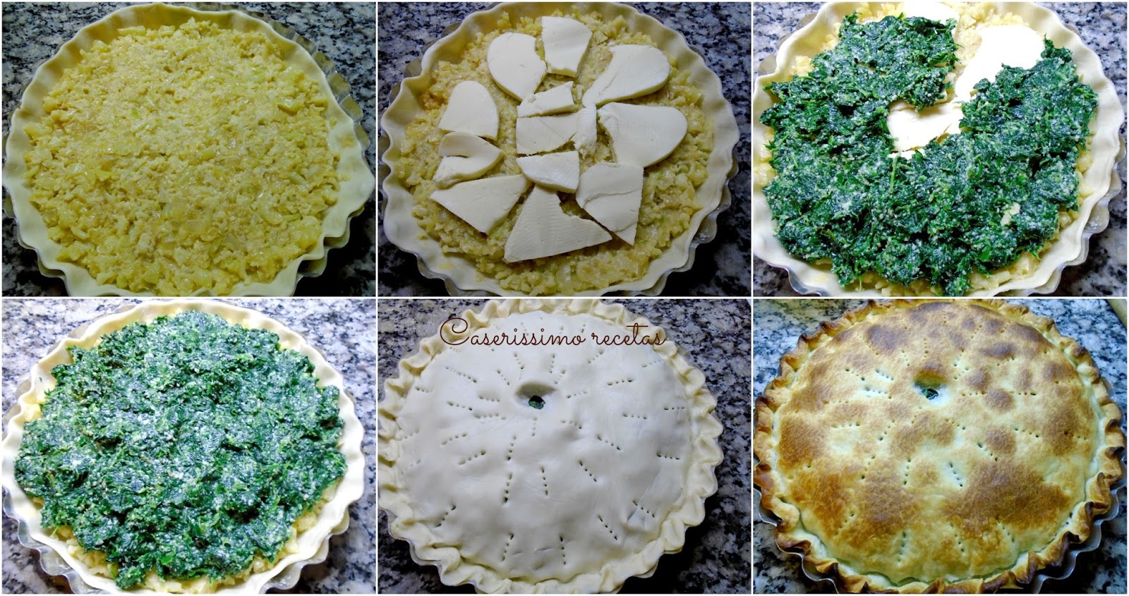 Cubrimos el disco con la coliflor preparada. Sobre ella el queso cortado y luego la espinaca ya preparada también. Ponemos el otro disco de masa. Pinchamos la superficie y hacemos un agujerito chimenea en el centro.