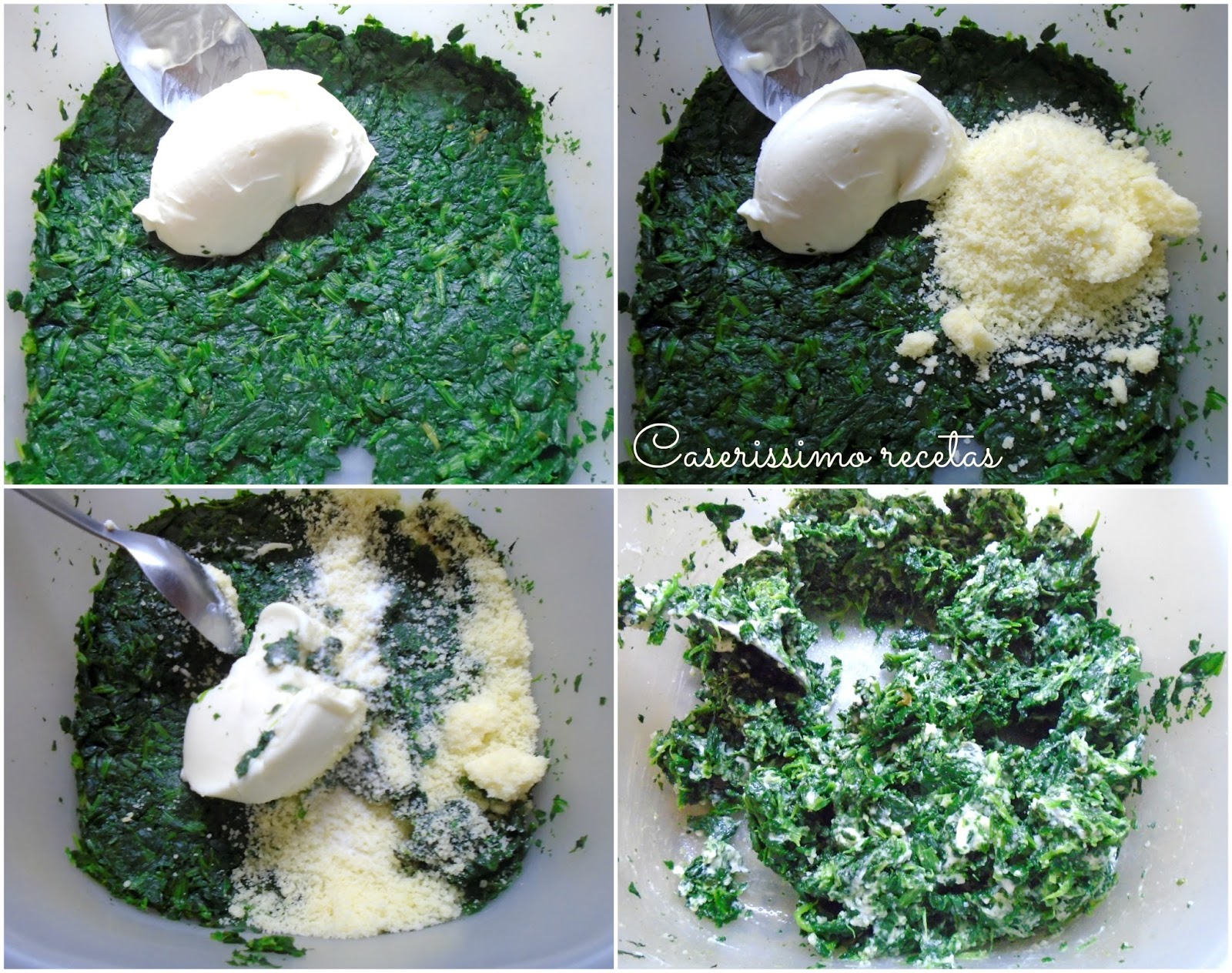 Escurrimos bien y le agregamos el queso crema, el queso rallado (50 gramos) y sal y pimienta a gusto. Mezclamos bien y reservamos.