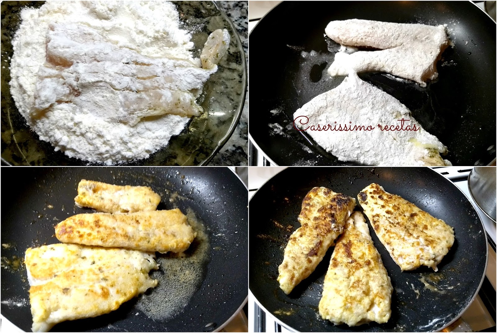 Retiramos de la heladera y ponemos a calentar una plancha o sartén de teflón o cerámica con fuego máximo. La rociamos con rocío vegetal o un chorrito finito de aceite. Cortamos los filetes al medio y pasamos dos o tres trozos por harina y los ponemos en la plancha bajando el fuego a mínimo. Dejamos cocinar de un lado unos 4 minutos y luego del otro 2 minutos. Si comprobamos que le falta, dejamos unos minutitos mas. Repetimos esto con todos los filetes. Esto puede variar por el grosor de los filetes o la intensidad del fuego.