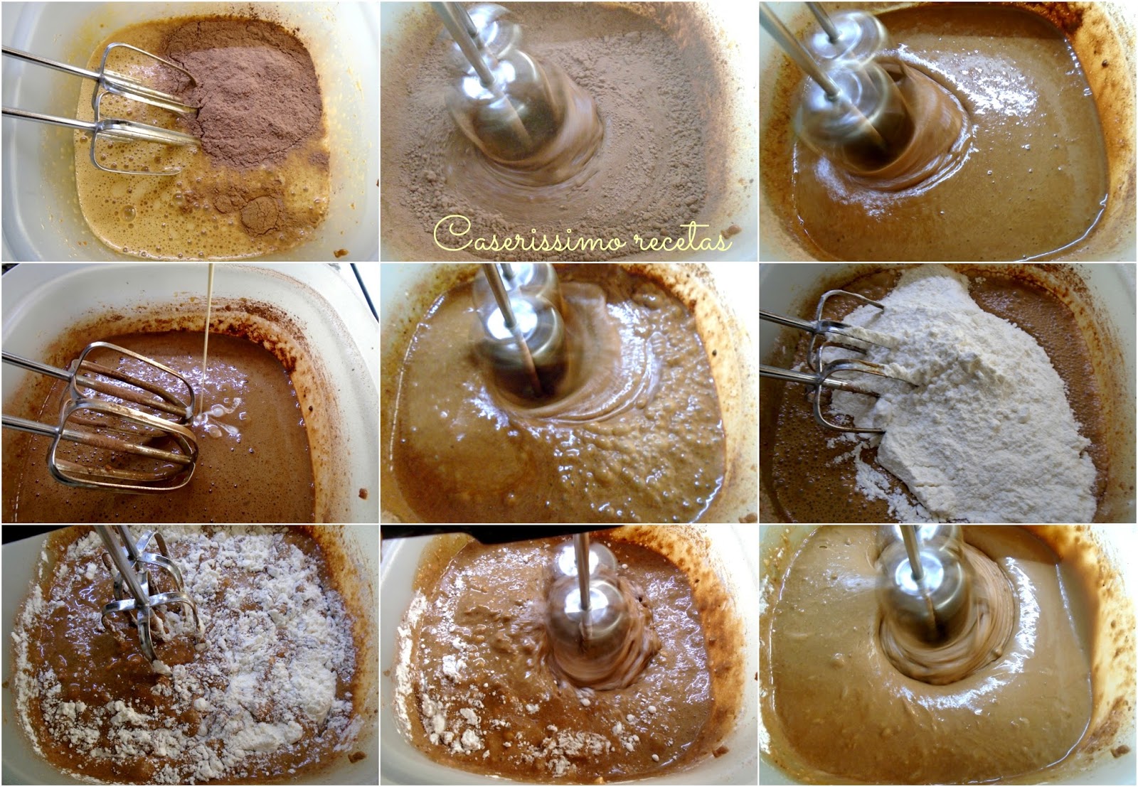 Por último añadimos la harina de una vez y mezclamos. Batimos durante 3 minutos y pasamos al molde engrasado y enharinado.