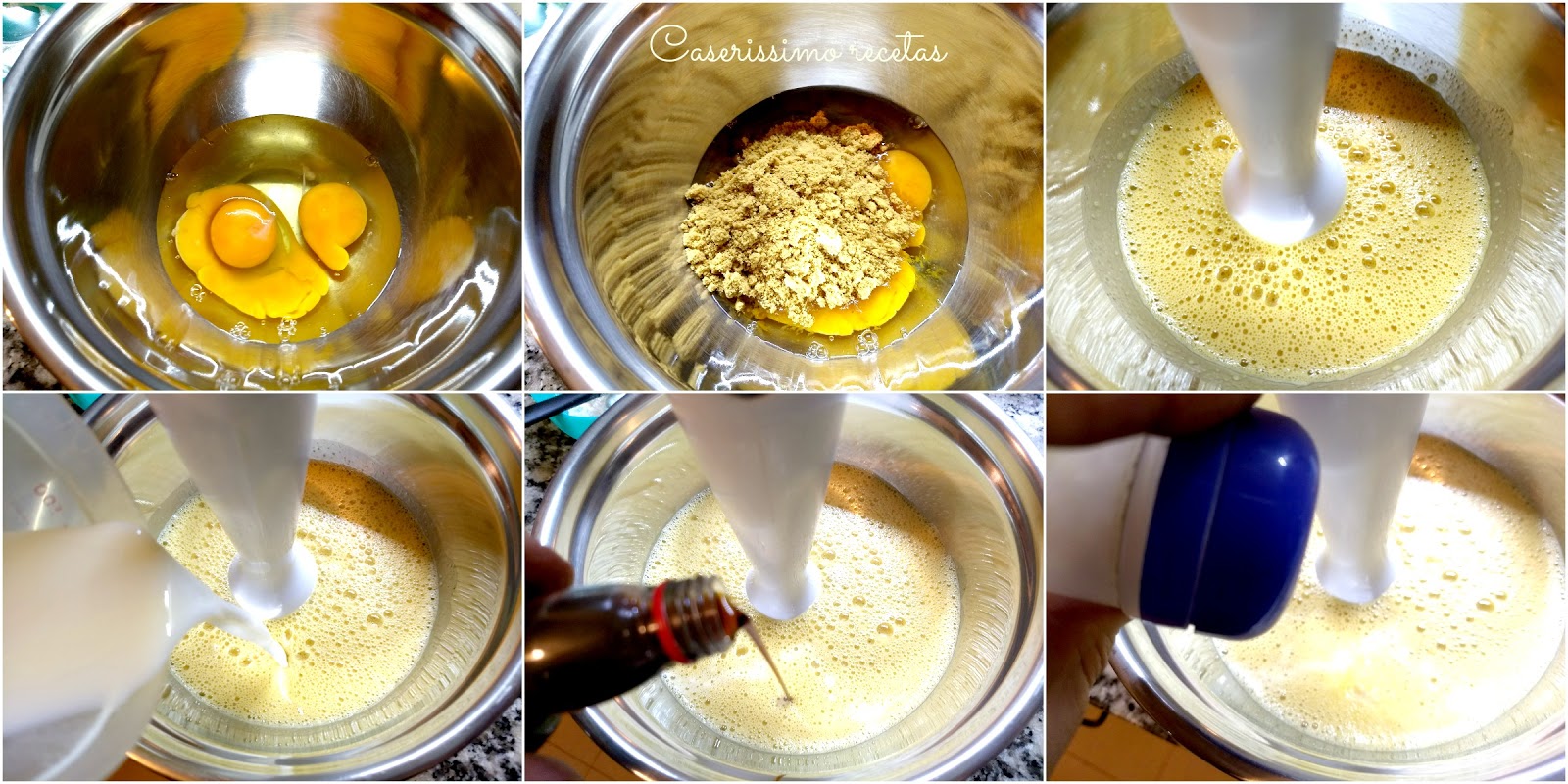 Batimos los huevos con el azúcar hasta espumar bien. Añadimos la leche, la esencia de vainilla y la sal, seguimos batiendo.