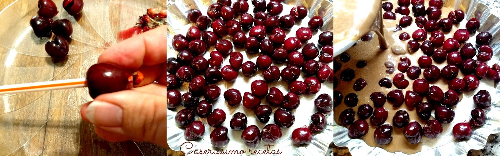 Pre calentamos el horno a 170°. Descarozamos las cerezas previo lavado y sacado de los cabos. Se pueden descarozar fácilmente con una pajita firme y gruesa, presionando de un lado, hacia el centro y así sale el carozo .