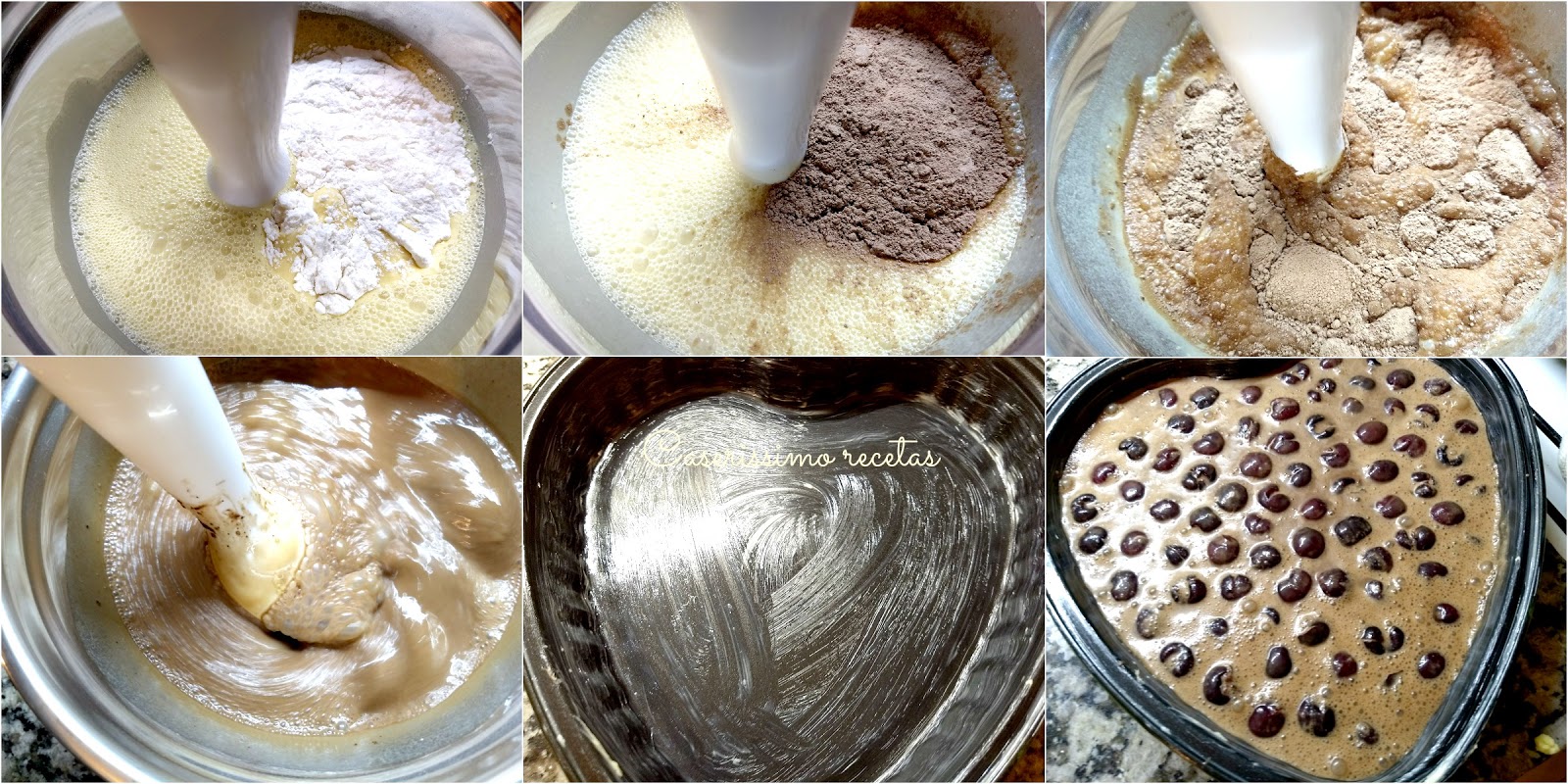 Ahora agregamos la harina y la batimos. Hacemos lo mismo con el cacao. Batimos hasta lograr una masa chirla, pareja y lisa. La vertemos sobre las cerezas. No les recomiendo un molde desmoldable, vean que yo usé uno y luego las pasé a otro en forma de corazón.