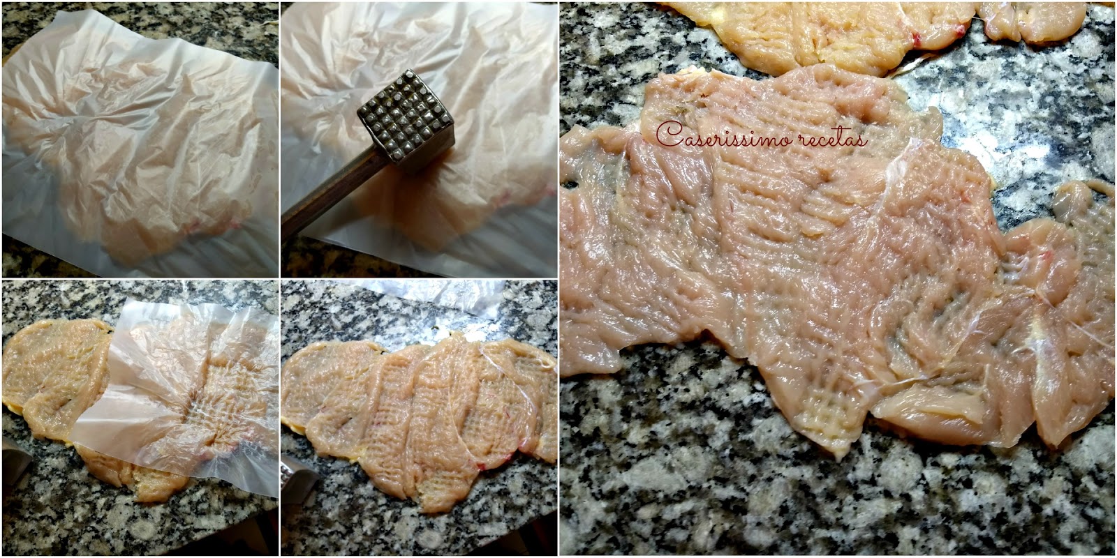 Igual si se separa en algunos lugares, no se hagan problema. Se une con las manos y si se rellena, al enrollarla se abre un poco pero luego, en la cocción, se sella, deben encimar apenas los bordes, con cuidado para que se selle al cocinarlas.  Si las van a rebozar, como en el Cordon bleu, el mismo pan rallado, cubre. Si las envuelven en lienzo o film o cubren con panceta, también se logra buen resultado. Glup!