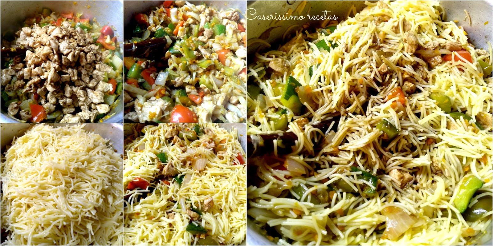 - Hervir agua con sal y condimento para arroz o azafrán. Cocinar fideos al dente. Si son de arroz, seguir indicaciones del envase, saborizando el agua.