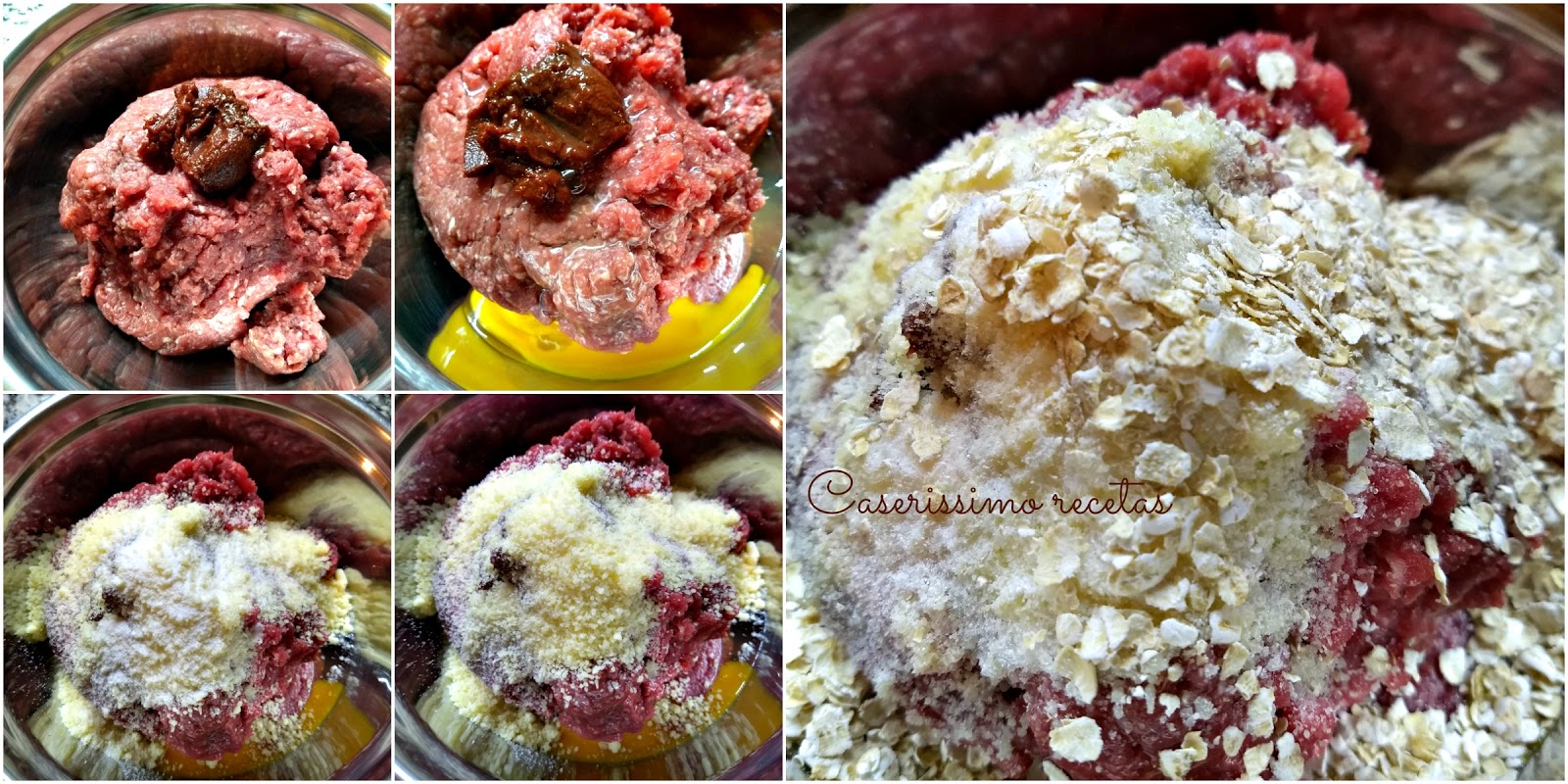 Ponemos en un bol la carne y todos los ingredientes, menos el rocío vegetal y la mozzarella.