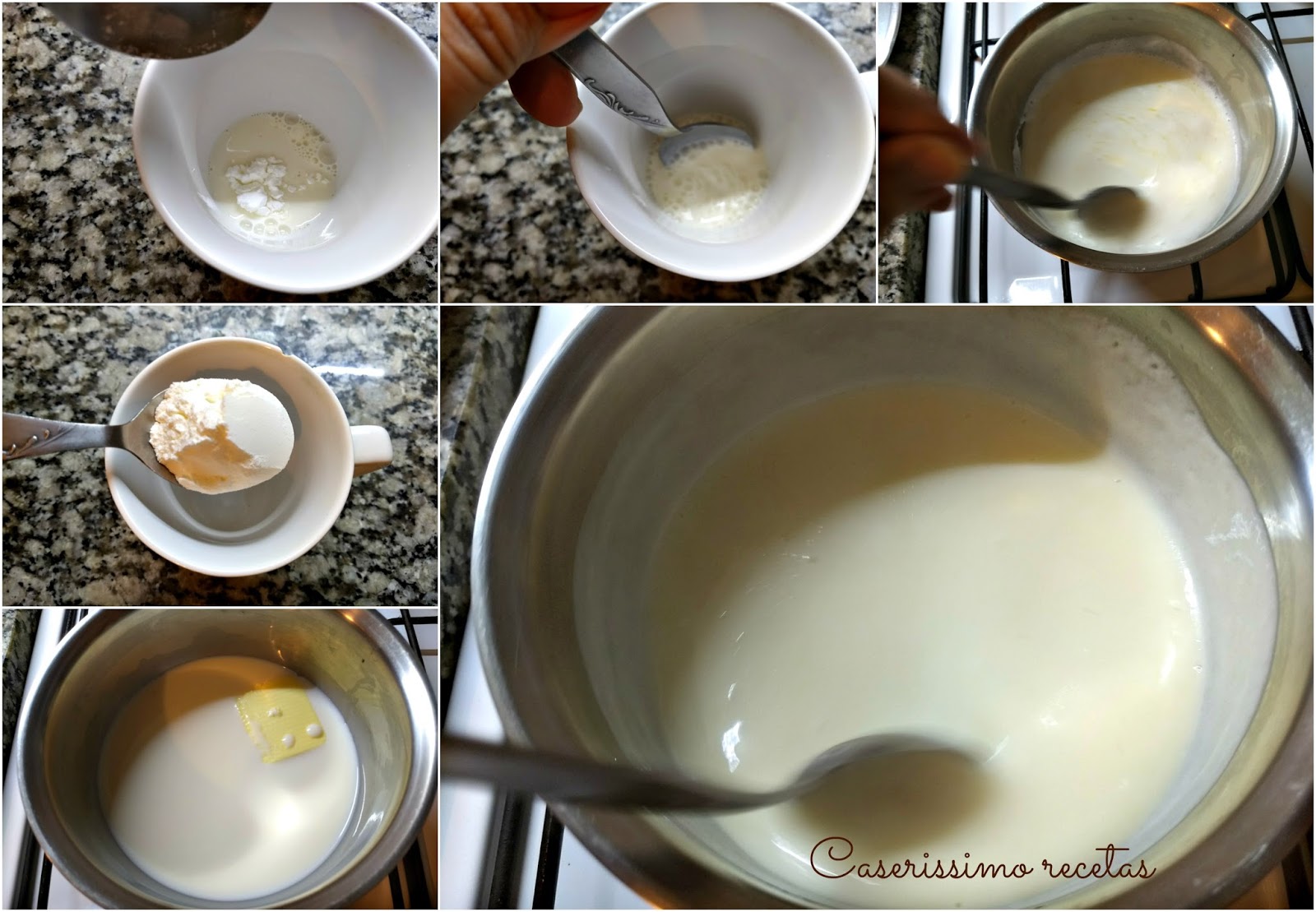 Cuando la leche da signo de comenzar a hervir, añadir el agua con el almidón y revolver constantemente con el fuego en mínimo y durante un minuto. Retirar del fuego y tapar con film pegado a la superficie.