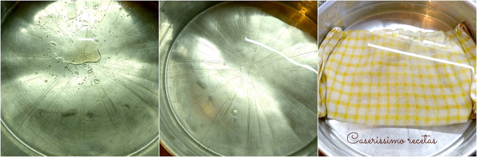 En una fuente profunda colocamos un repasador doblado, en el fondo, para evitar salpicaduras y vertemos agua bien caliente hasta la mitad o un poco mas. Si los elementos que usamos son de aluminio, les aconsejo poner jugo de limón recién exprimido, dos cucharadas para evitar que se ennegrezcan.