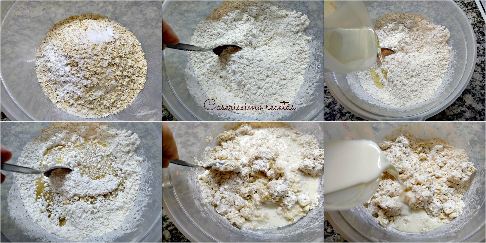 Poner en un bol la harina, la avena, el polvo de hornear y la sal. Mezclar bien a añadir el aceite, mezclar un poco y agregar la leche.