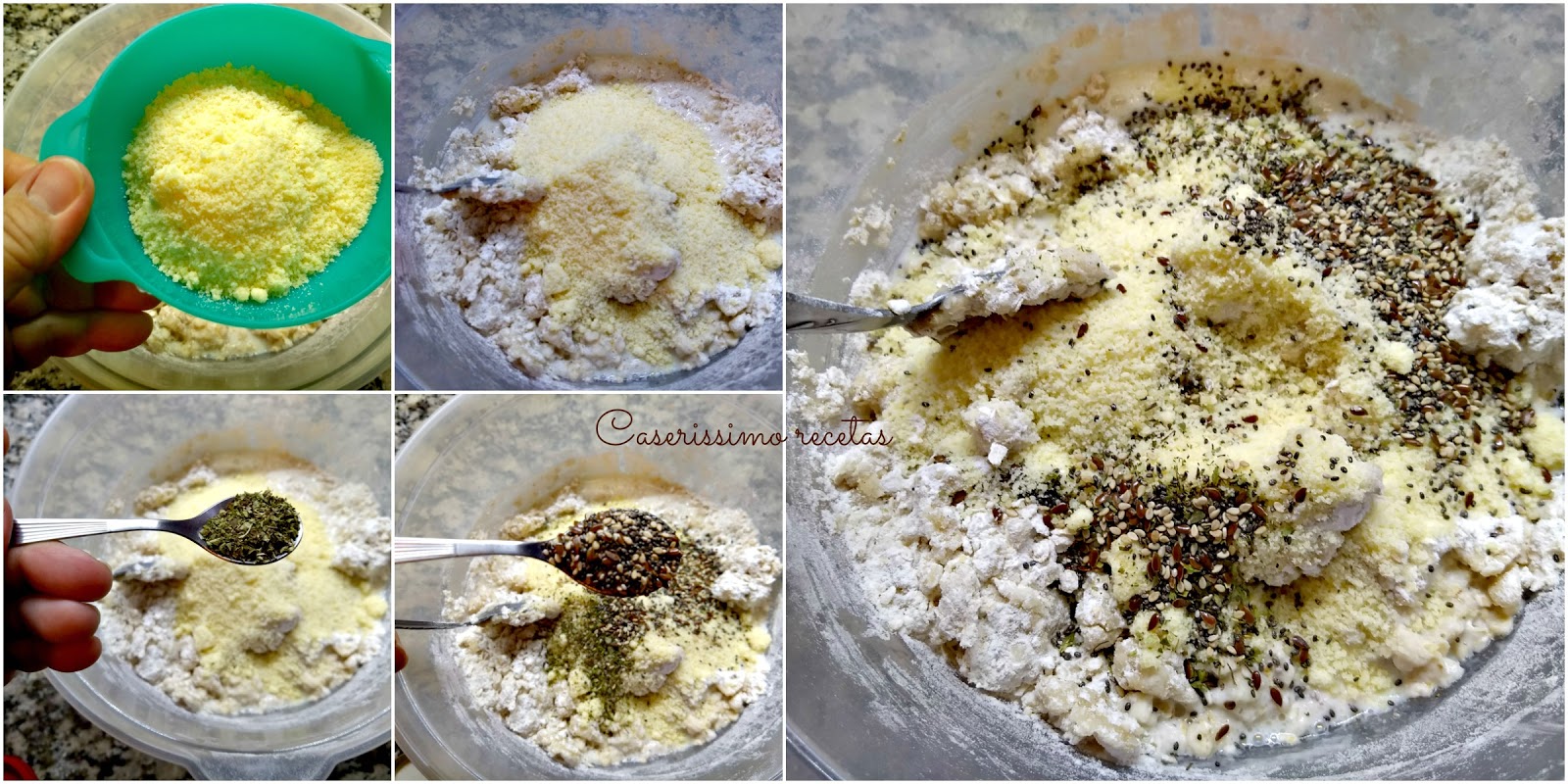 Amasar apenas un poco y añadir el queso, orégano y semillas.