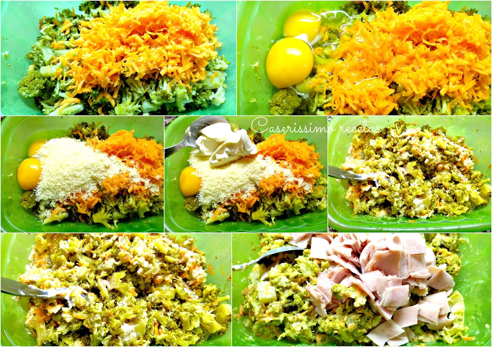 En un bol mezclar el brócoli, las zanahorias, los huevos, sal y pimienta (opcional, yo no usé) a gusto, queso crema, queso rallado, y jamón picado.