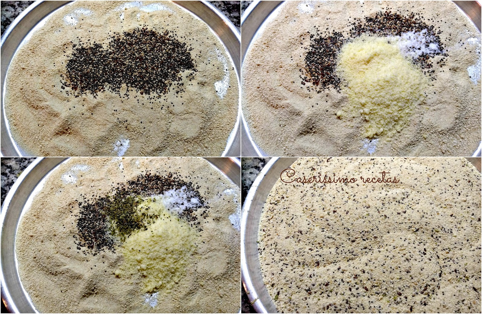 En una fuente bien plana y grande, como puede ser una pizzera, colocamos el pan rallado (yo lo hice en dos veces) el queso, las semillas y el orégano y sal a gusto. Mezclamos muy bien para que se integran bien los ingredientes, incluso la sal.