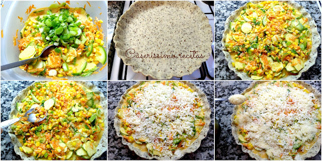 De a poco nos vamos acercando a la tarta número 100. Guau! Y ya tengo varios sabores, así que fácilmente llegaremos, Dios mediante.Esta es muy rica, con una base de masa de semillas y varios vegetales en su interior, mezclados con el aparato bomba (crema, queso rallado y huevos).